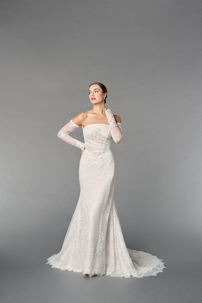 Während böhmische Spitzenapplikationen tendenziell eher bei Boho-Brautmode zu finden ist, sind feinere Spitzenarten, gerne auch mit Paillettenbestickung, beim Glamour Look nicht wegzudenken.